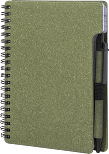 Spirálový blok A6 z recyklovaného papíru s 80 linkovanými listy. Včetně recyklovaného papíru a kuličkového pera z recyklovaného PP s modrou náplní.