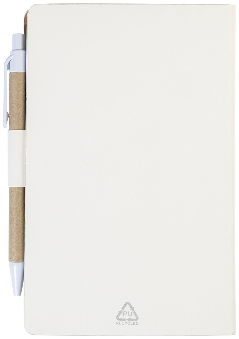 Blok s recyklovanou PU kůží, 70 linkovanými listy z recyklovaného papíru a 125 značkovači stránek (v 5 různých barvách). Včetně recyklovaného papíru a kuličkového pera z recyklovaného PP s modrou náplní.