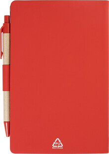 Blok s recyklovanou PU kůží, 70 linkovanými listy z recyklovaného papíru a 125 značkovači stránek (v 5 různých barvách). Včetně recyklovaného papíru a kuličkového pera z recyklovaného PP s modrou náplní.
