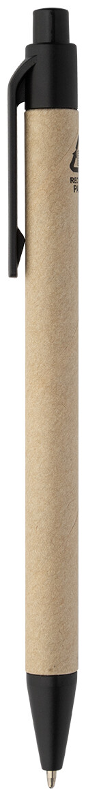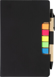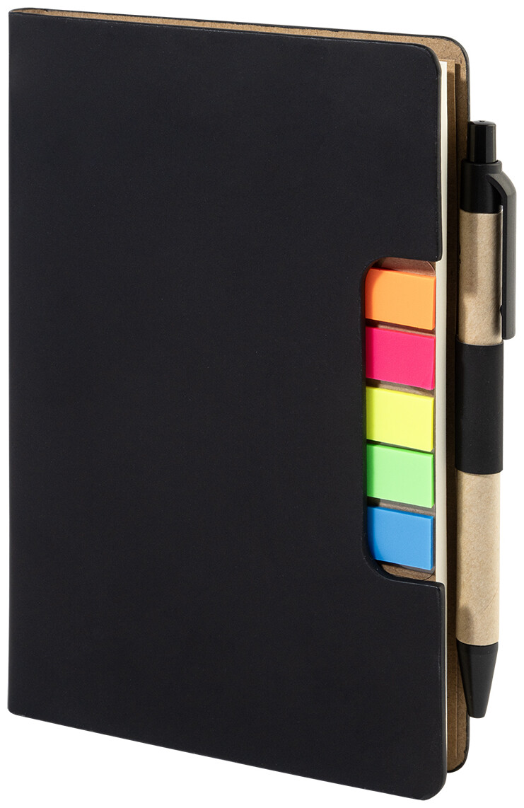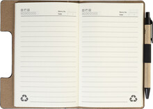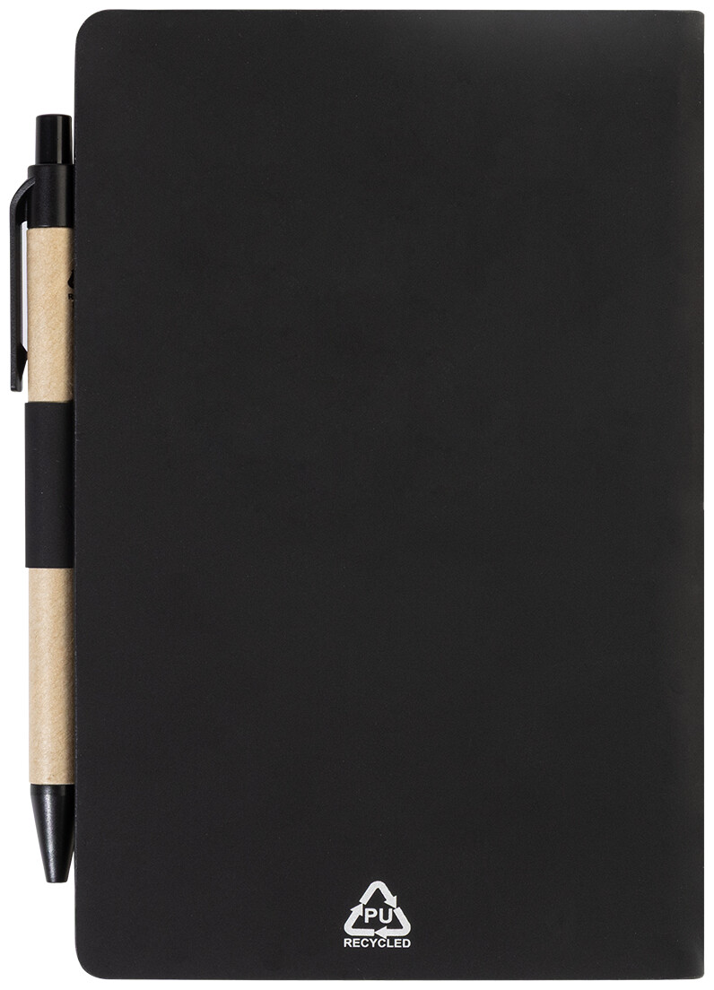 Blok s recyklovanou PU kůží, 70 linkovanými listy z recyklovaného papíru a 125 značkovači stránek (v 5 různých barvách). Včetně recyklovaného papíru a kuličkového pera z recyklovaného PP s modrou náplní.