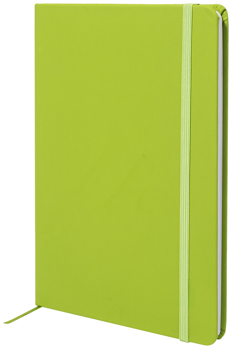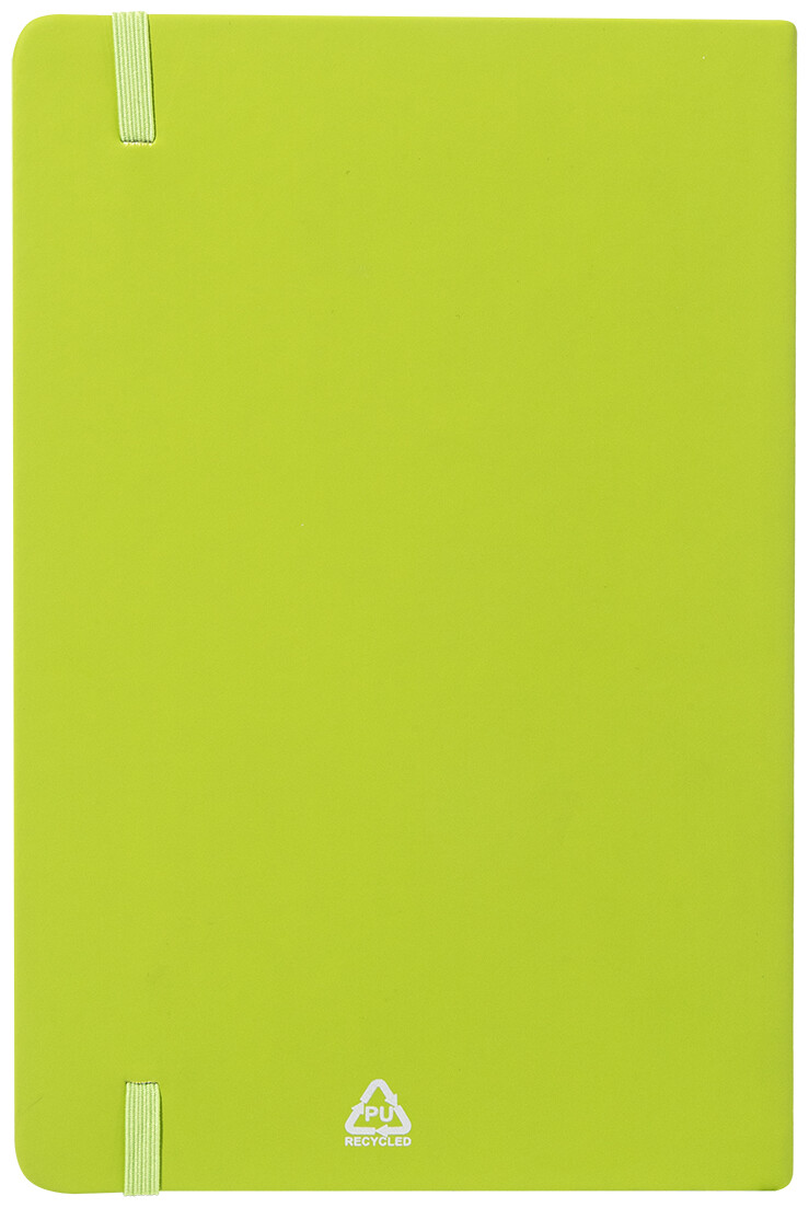 Blok potažený recyklovanou PU kůží se 100 linkovanými listy z recyklovaného papíru. Se záložkou v odpovídající barvě a gumičkou. Velikost A5.