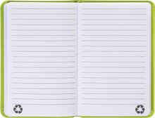 Blok potažený recyklovanou PU kůží se 100 linkovanými listy z recyklovaného papíru. Se záložkou v odpovídající barvě a gumičkou. Velikost A6.