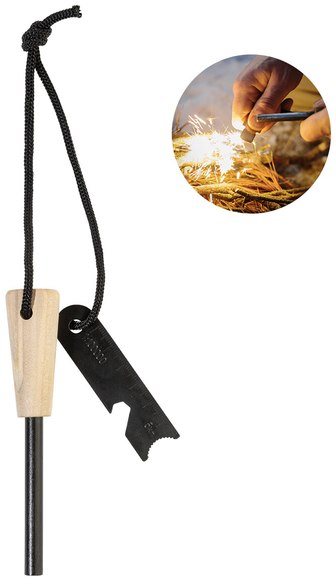 Nářadí na zapalování ohně pro přežití s dřevěnou rukojetí a multifunkční škrabkou z nerezové oceli, vybavené pravítkem, otvírákem na lahve a imbusovým klíčem.