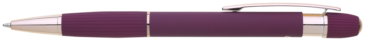 propiska z recyklovaného hliníku se soft povrchem a doplňky v růžovo-zlaté barvě. Laserované logo je lesklé, růžovo-zlaté. Náplň modře píšící. Výsledný efekt laserového značení je lesklý, v barvě doplňků.