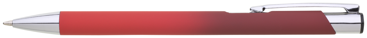 Hliníková propiska se stříbrnými doplňky a měkkým pogumovaným soft povrchem ve červeno–tmavě červeném přechodu. Náplň velkoobsahová, modře píšící.