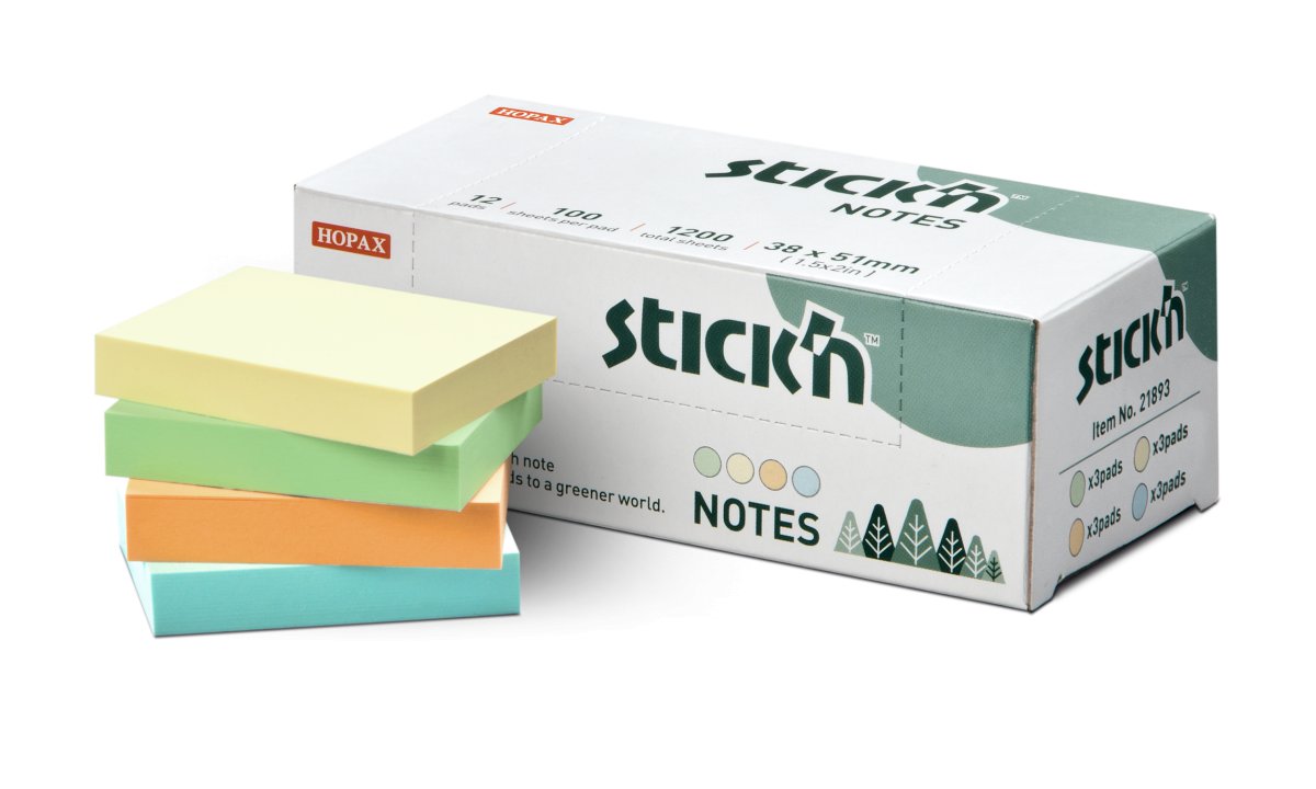 Samolepicí bloček Stick'n by Hopax FSC, 38 x 51 mm, mix pastelových barev, 12 x 100 lístků