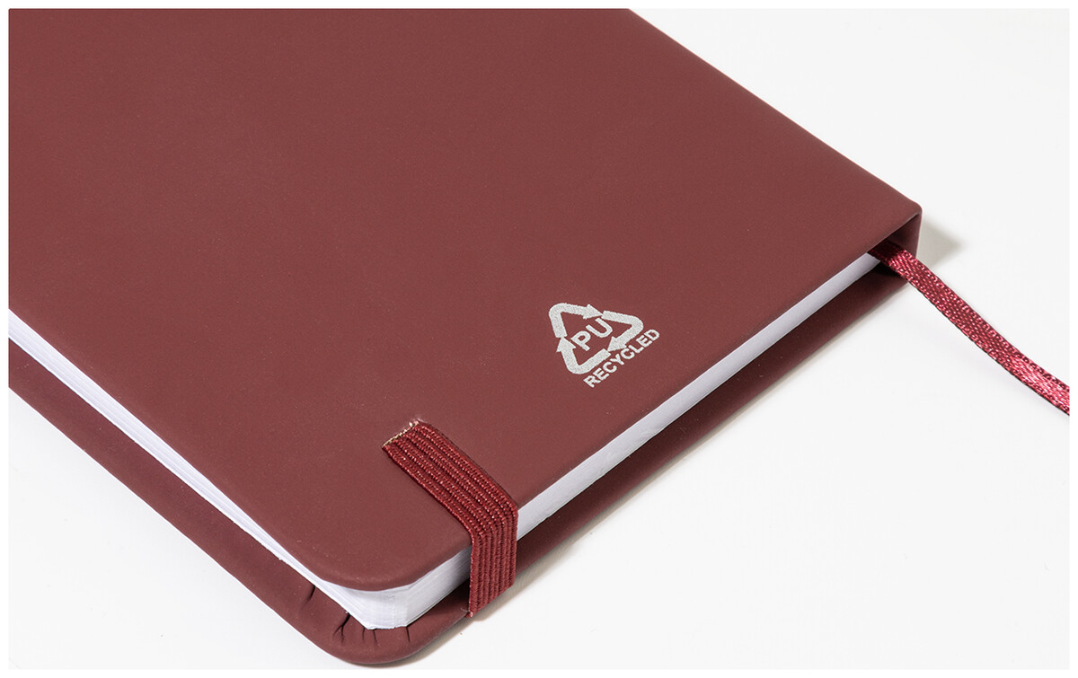 Blok potažený recyklovanou PU kůží se 100 linkovanými listy z recyklovaného papíru. Se záložkou v odpovídající barvě a gumičkou. Velikost A6.