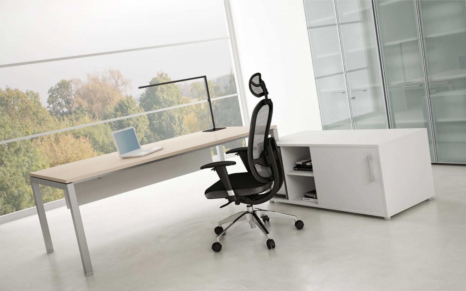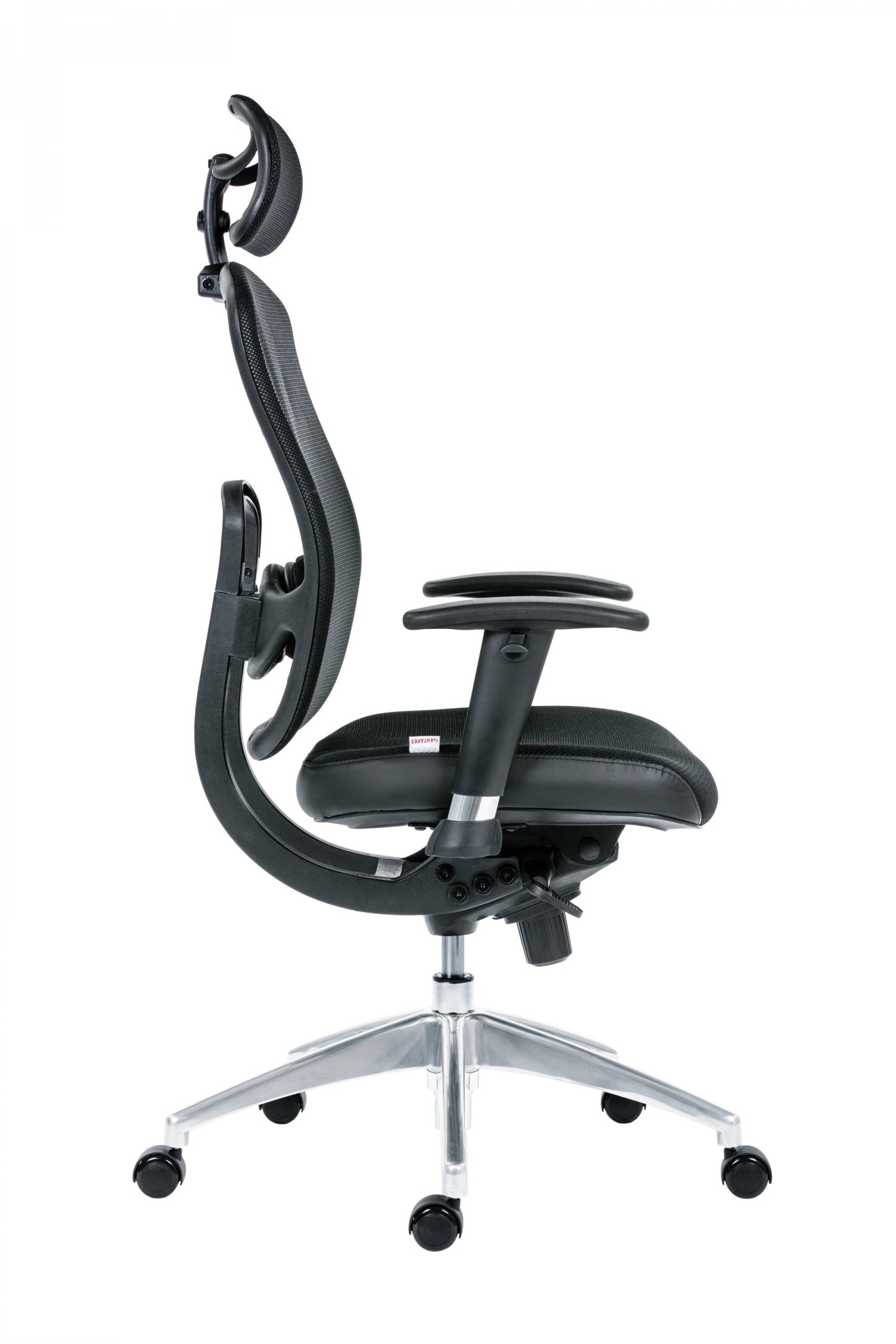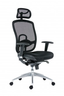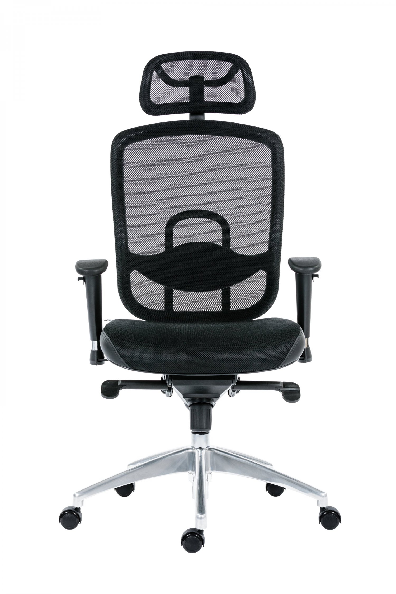 pracovní židle s prodyšným opěrákem a opěrkou hlavy, synchronní mechanismus s nastavením síly protiváhy a několikanásobnou aretací, bederní regulovatelná opěrka, svisle a vodorovně nastavitelné područky s měkkou dotykovou plochou, aluminiová leštěná báze, kolečka s gumovou obručí pro všechny typy povrchů, nosnost 130 kg, záruka 24 měsíců
