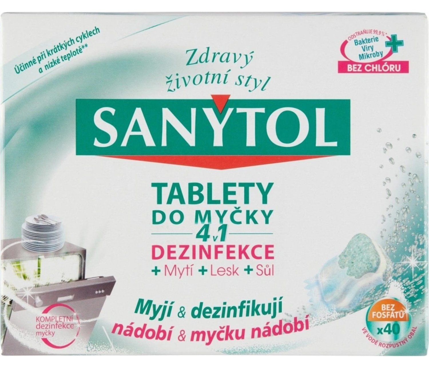 Sanytol tablety do myčky nádobí 4 v 1 kombinují zároveň dezinfekci, mytí, sůl a lesk. Jejich jednečné složení tak zajišťuje optimální čistotu nádobí (bez předoplachu) a vlastní myčky i při krátkých programech a mytí při nízké teplotě. 4 v 1