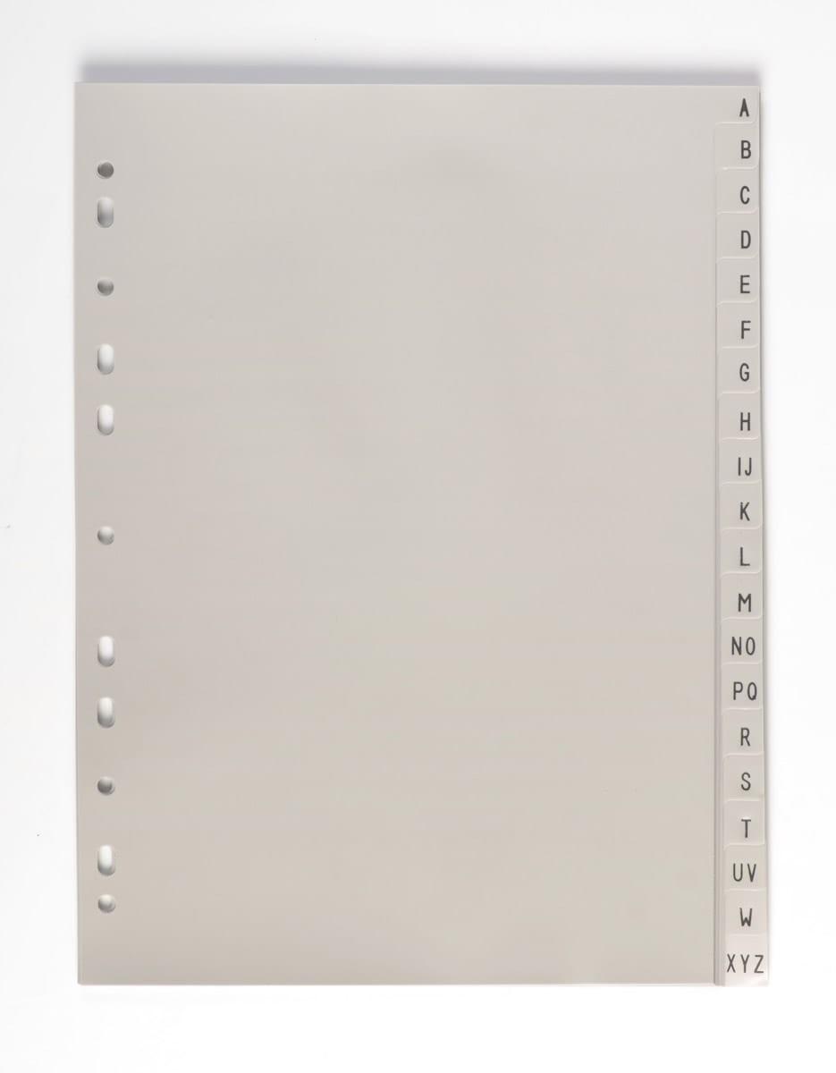 Rozdružovač, rozlišovač nebo rejstřík. Praktická pomůcka pro oddělování dokumentů, rejstřík A-Z, formát A4, šedá barva. Vhodné k zavěšení do pořadače. Polypropylen, síla 120 mikronů