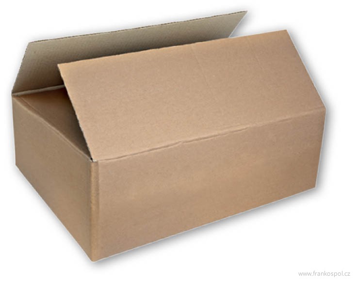 Hnědé krabice z vlnité lepenky, klopy se lepí páskou. Balení 25 ks. Rozměry: 428 x 304 x 334 mm.