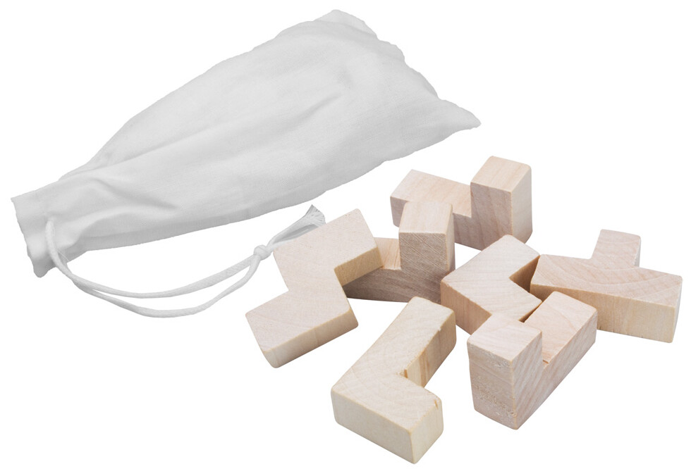 Dřevěná hra puzzle ve tvaru kostky v bavlněném pytlíku přírodní barvy. Rozměr 96×165 mm.
