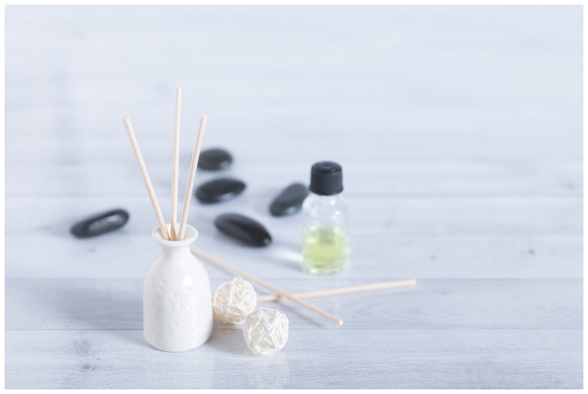 Aroma sada s jasmínovým olejem, mini keramickou vázou, 5 dřevěnými tyčinkami a 2 dřevěnými kuličkami. V dárkové krabičce.