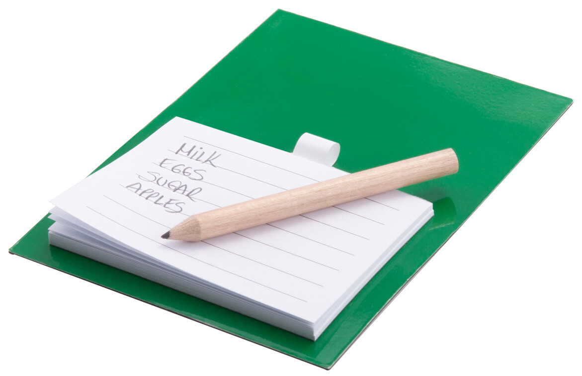 Barevná magnetka na ledničku se 40ti listým blokem a mini dřevěnou tužkou.