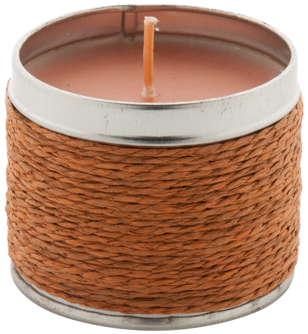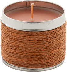 Vonná svíčka v kovové krabičce omotané provázkem.