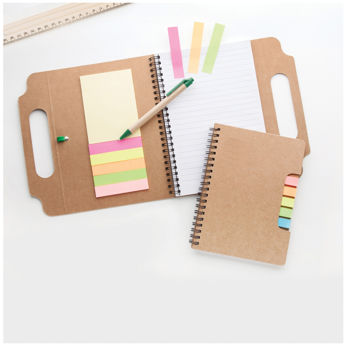Poznámkový blok z recyklovaného papíru se spirálovou vazbou a se 70 linkovanými listy, kuličkovým perem a samolepícími poznámkovými lístky (125 malých a 25 velkých).