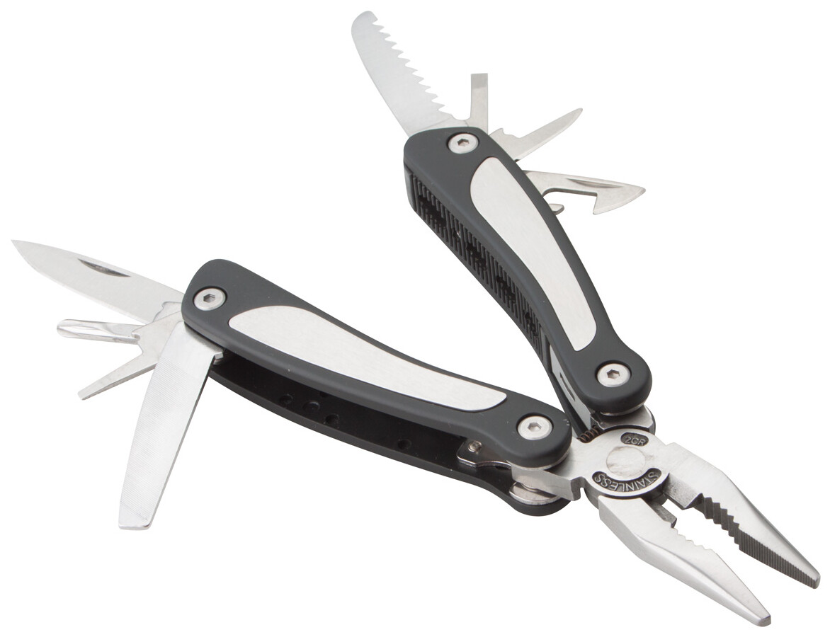 Multifunkční kleště z nerezové oceli s 9ti funkcemi: kleště, pilník, 3 šroubováky, 2 velikosti nožů, otvírák na plechovky a pilka. Dodáváno s polyesterovým pouzdrem.