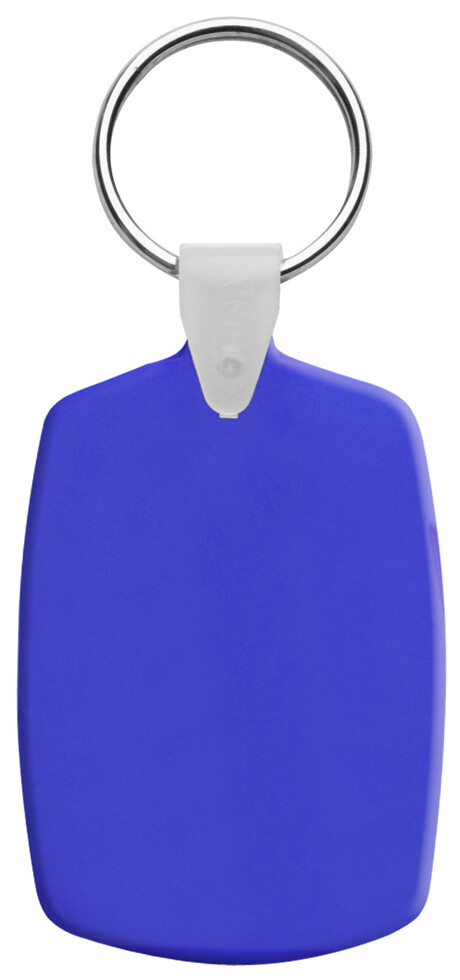 Plastový obdélníkový přívěšek na klíče s kovovým kroužkem.