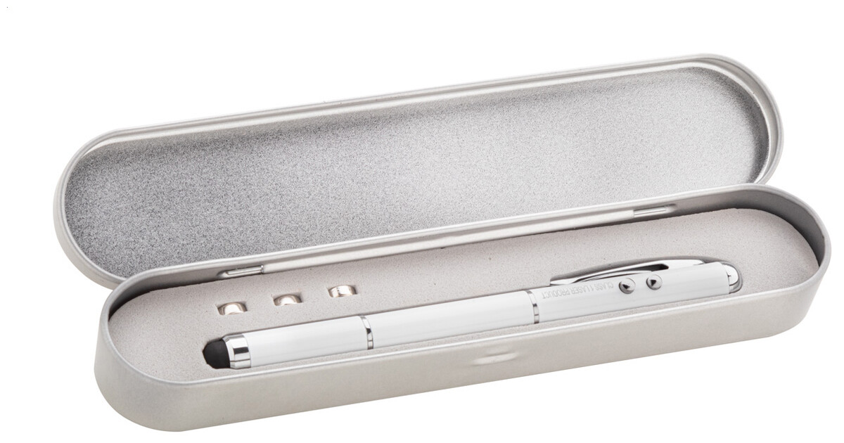 Multifunkční laserové ukazovátko s perem pro dotykové displeje a LED světlem. V kovové krabičce. Dodáváno včetně baterií a s modrou náplní.