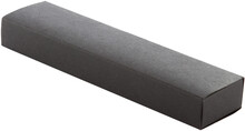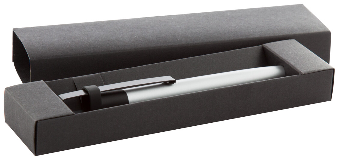 Hliníkové pero s modrou náplní v černé dárkové krabičce.