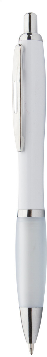 Plastové kuličkové pero s bílým tělem, barevným úchopem a lesklými chromovanými částmi. S modrou náplní.
