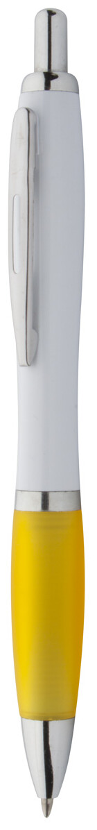 Plastové kuličkové pero s bílým tělem, barevným úchopem a lesklými chromovanými částmi. S modrou náplní.