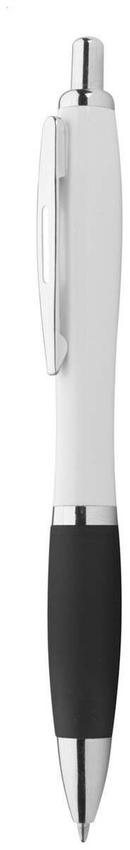 Plastové kuličkové pero s bílým tělem, barevným úchopem a lesklými chromovanými částmi. S modrou náplní.