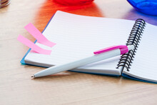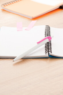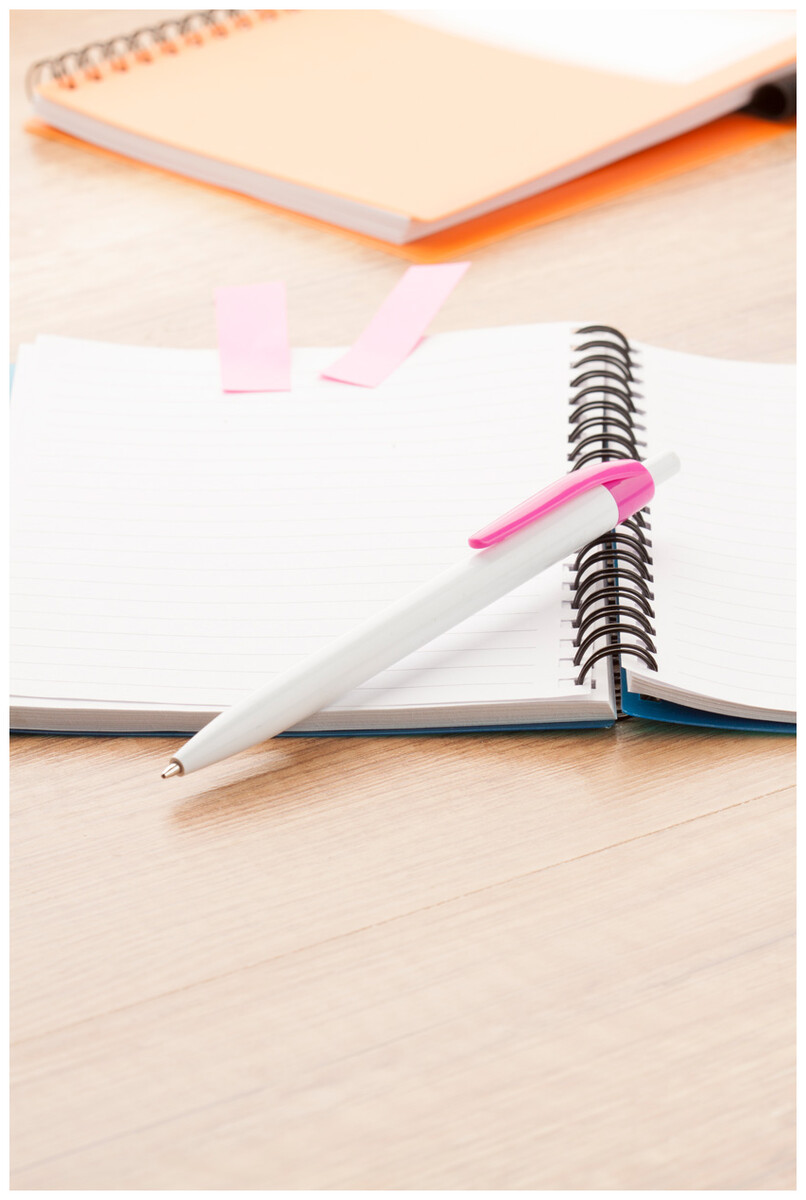 Plastové kuličkové pero s bílým tělem a barevným klipem, s modrou náplní.