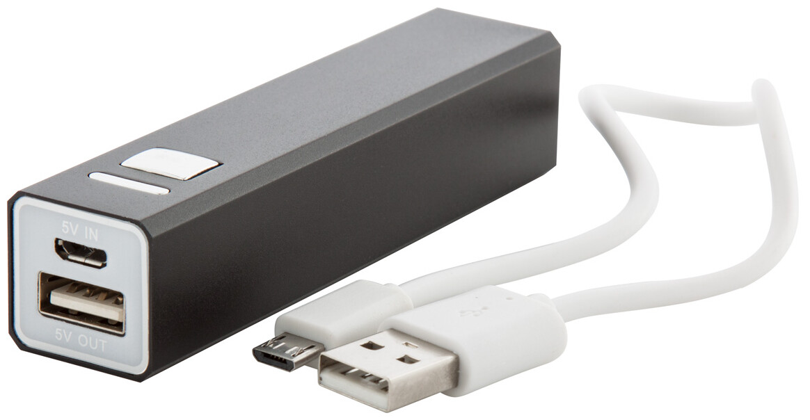 Hliníková USB power banka s 2200 mAh baterií, vč. mikro USB nabíjecího kabelu.