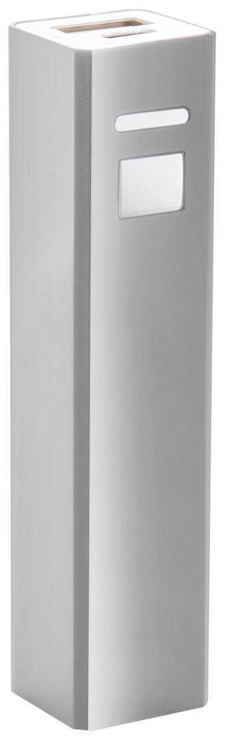 Hliníková USB power banka s 2200 mAh baterií, vč. mikro USB nabíjecího kabelu.