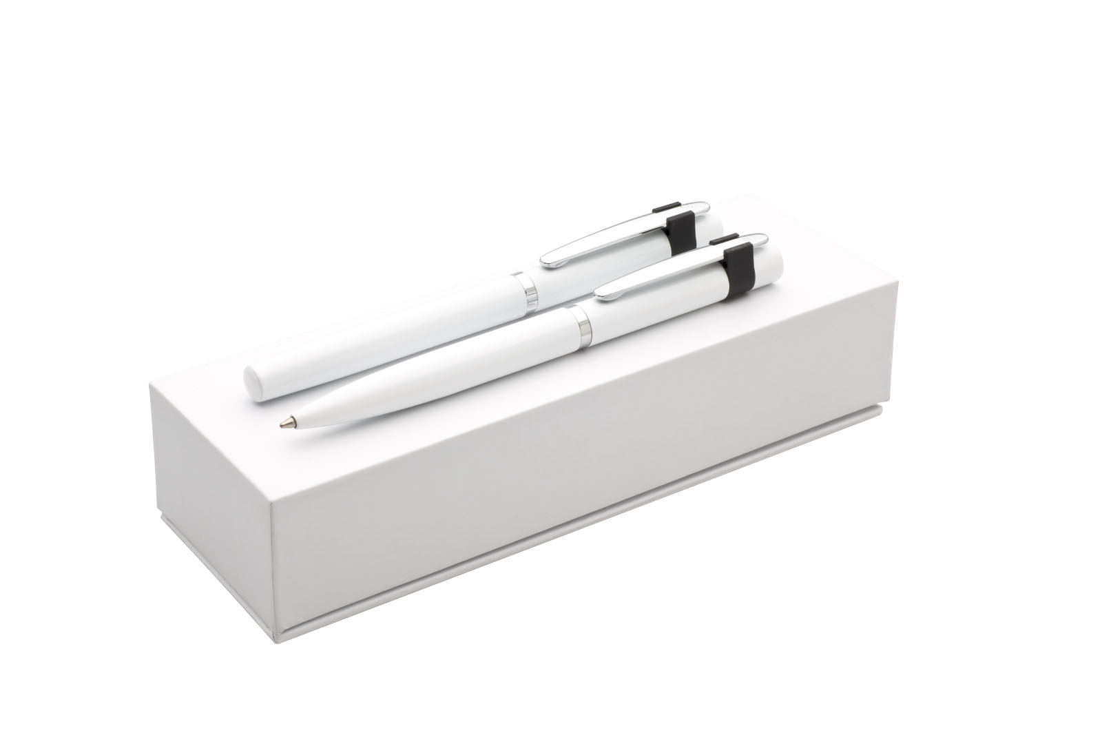 Elegantní dárková sada s propiskou a rollerem v bílé krabičce se značkou GABRIELIS. Tužky mají otočný mechanismus, roller odnímatelné víčko. Povrch tužek bílý se stříbrným klipem v černém úchytu.