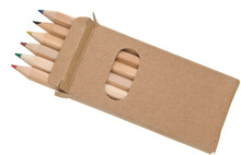 Přírodní, krátké, dřevěné, hrocené pastelky, 6 ks v papírovém obalu. Rozměr obalu 90 x 45 x 8 mm. Balení po 100 ks.
