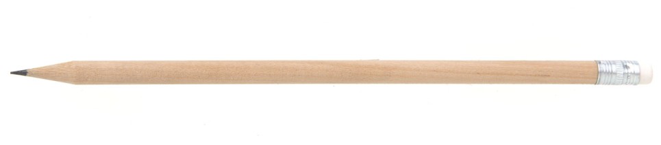 Kulatá, přírodní, dřevěná, grafitová tužka HB s bílou gumou, hrocená.