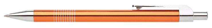 Kuličkové pero LAURIA je vyrobeno z hliníku. Má oranžové tělo se stříbrnými doplňky jako jsou špička, klip a cvakátko. Úchopová část má 10 stříbrných proužků po celém obvodu tužky. Náplň- X20, modře píšící.