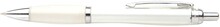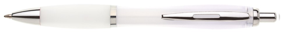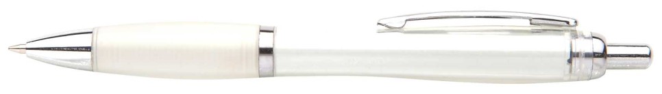 Oblíbené plastové propisovací pero ULTA s celobarevným, transparentním bílým tělem. Barva pogumovaného úchopu je stejná jako tělo. Pero je zdobené stříbrným proužkem, ostatní doplňky jsou také stříbrné. Náplň je velkoobsahová, modře píšící. Kolekce EVERGR