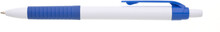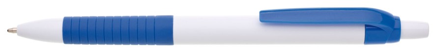 Propiska s bílým tělem, modrým gripem a klipem, náplň modře píšící.