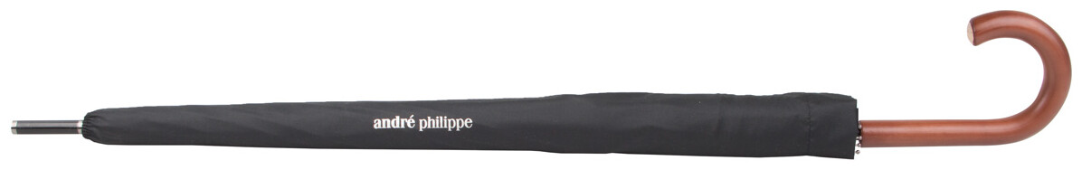Automatický, větruodolný deštník s černými a šedými proužky a 8 panely, dřevěná rukojeť, kovová tyčka a konstrukce ze skelných vláken. 190 T pongee. V obalu s logem André Phillipe.