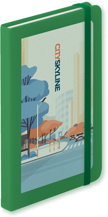 Blok s deskami z PU kůže, se 100 linkovanými listy, záložkou a gumičkou. Velikost A6.