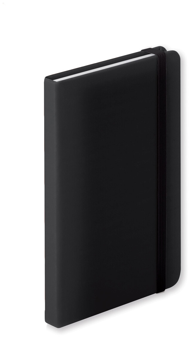 Blok s deskami z PU kůže, se 100 linkovanými listy, záložkou a gumičkou. Velikost A6.
