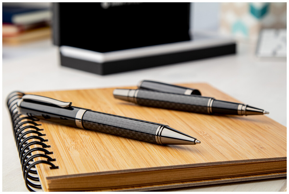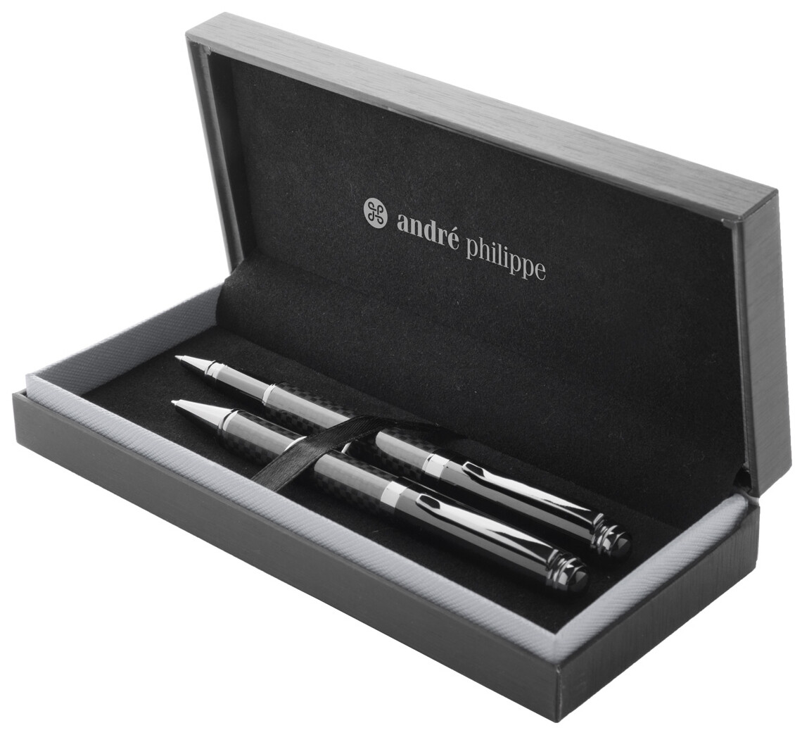 Elegantní sada kovového kuličkového pera a rolleru s karbonovým tělem. V černé dárkové krabičce, s modrou náplní. Značkový produkt André Philippe.