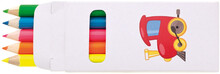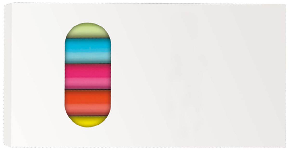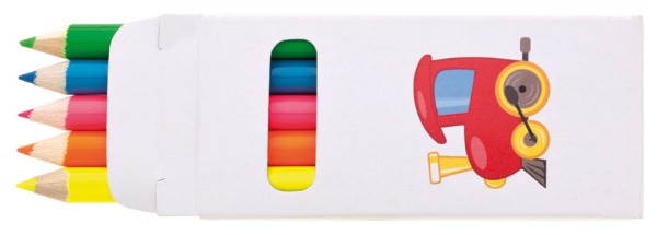 Lakované, krátké pastelky v pěti neonových barvách. Bílá papírová krabička.