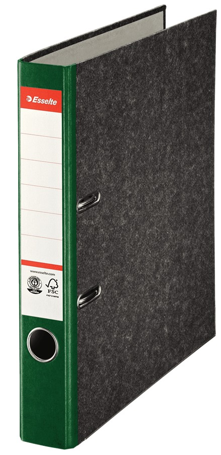 Formát A4 s vnějším potahem z tmavého mramorovaného papíru, barevným hřbetem a vnitřním potahem ze světlého mramorovaného papíru. Hřbetní otvor pro snadnou manipulaci, kovové lišty pro delší životnost, uzavírací mechanismus drží pořadač vždy pevně zavřený. Hřbet šíře 5 cm, barva zelená.