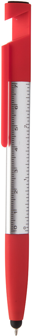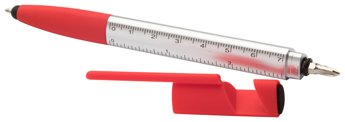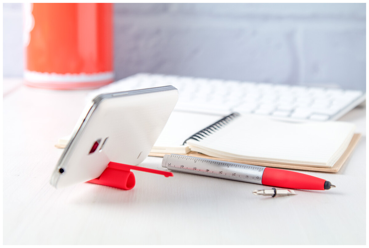 Plastové kuličkové a dotykové pero 5v1 se stojánkem na mobil, pravítkem, čistítkem a s funkcí šroubováku, s modrou náplní.