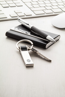 Elegantní set s kuličkovým perem s černou náplní, vizitkářem a klíčenkou. Materiál kov/PU kůže. Značkový produkt André Philippe.