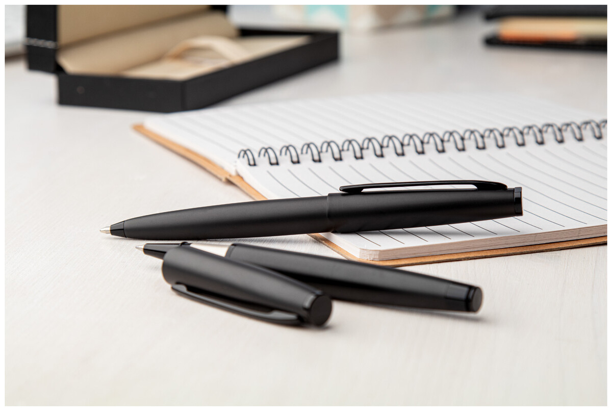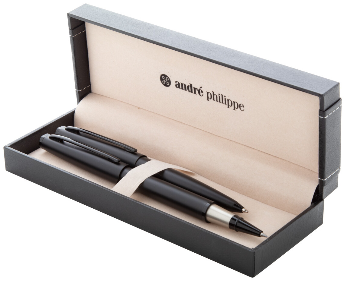 Elegantní sada kovového kuličkového pera a rolleru v matné černé úpravě. Ve speciální papírové dárkové krabičce a s modrou náplní. Značkový produkt André Philippe.