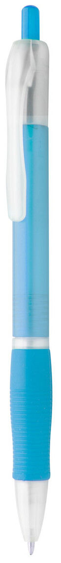 Plastové kuličkové pero s pogumovaným gripem a s modrou náplní.