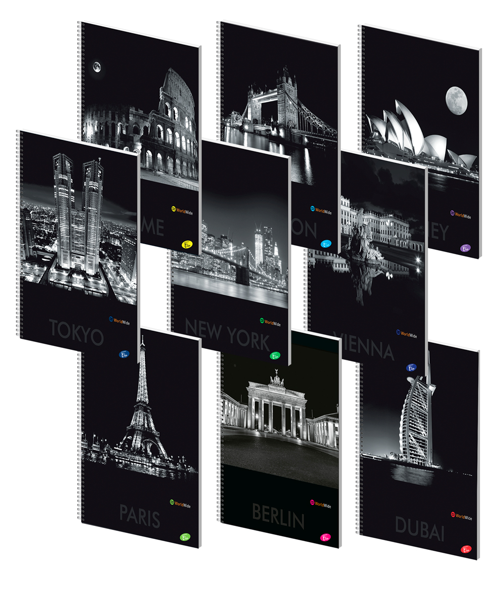 Působivé černobílé fotografie světových metropolí tvoří kolekci obalů kvalitních sešitů nejen pro studenty. Matnou pevnou obálku doplňují leskem zvýrazněné detaily. Formát A5, 70 listů (papír 80 g), linkovaný. Celkem 9 různých motivů. Balení: 10 ks.