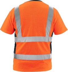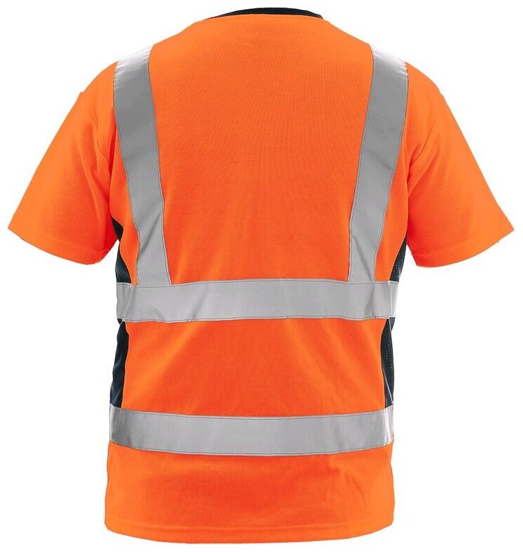 Výstražné tričko s kulatým průkrčníkem v kontrastní modré barvě, krátký rukáv, reflexní pruhy: 2 horizontální, 2 vertikální (šíře 5 cm), po stranách panely ze síťoviny v modré barvě. Doporučené použití: stavebnictví, silničáři, řidiči, logistika, údr