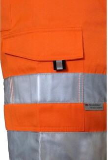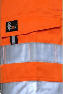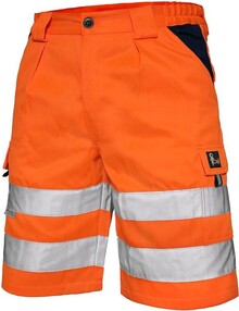 Pánské výstražné kraťasy, pas s poutky na opasek a gumou v bocích, přední klínové kapsy, zadní kapsy s klopou na suchý zip, boční kapsy s klopou na suchý zip, levá boční kapsa rozdělena na dvě komory, reflexní pruhy 3M.