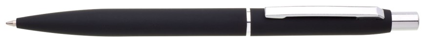 Kovová černě pogumovaná propiska se stříbrnými doplňky a efektem lesklého stříbrného laseru.